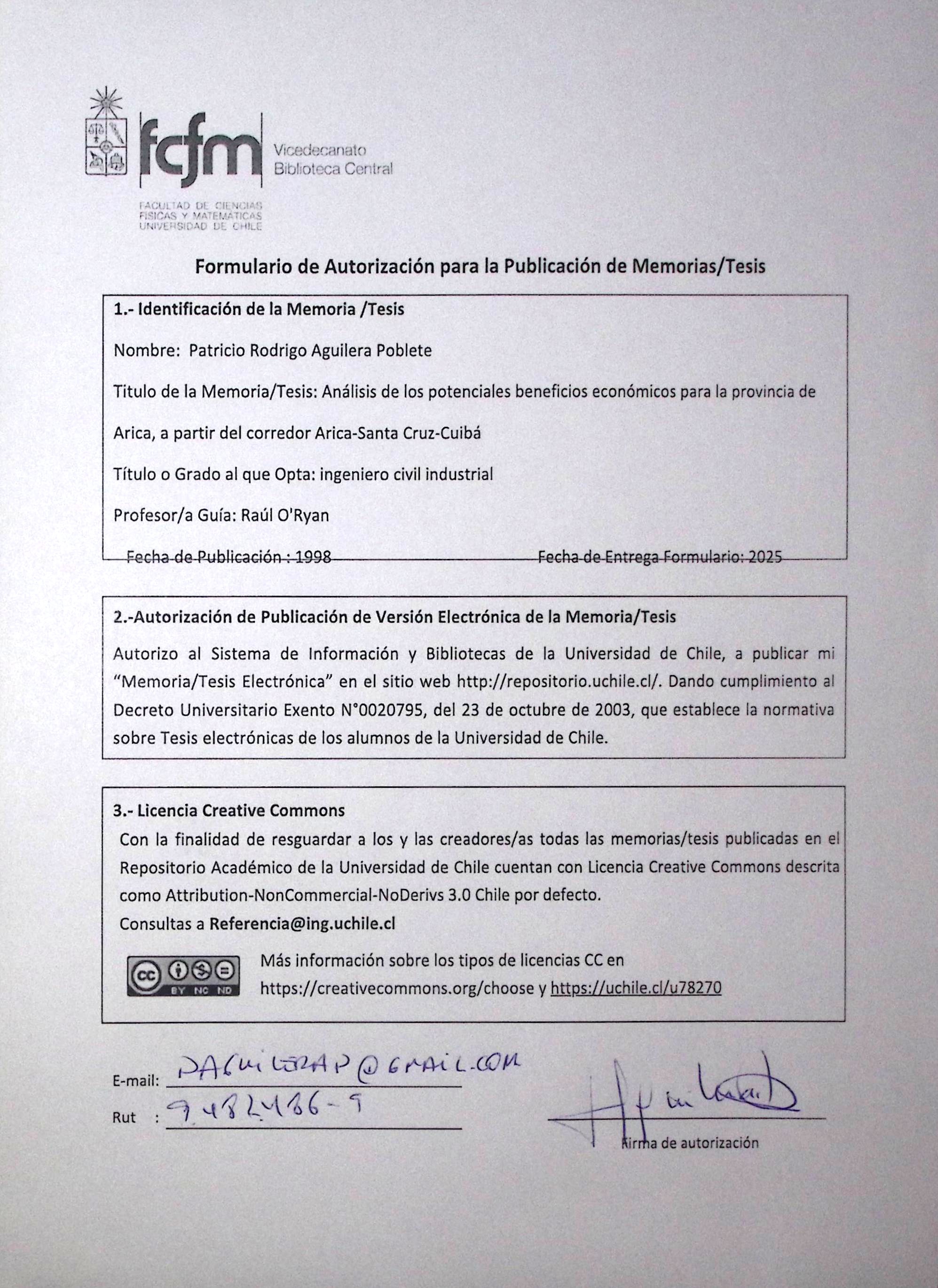 | Título | dc.title | Análisis de los potenciales beneficios económicos para la provincia de Arica, a partir del corredor Arica-Santa Cruz- Cuibá | es_ES |